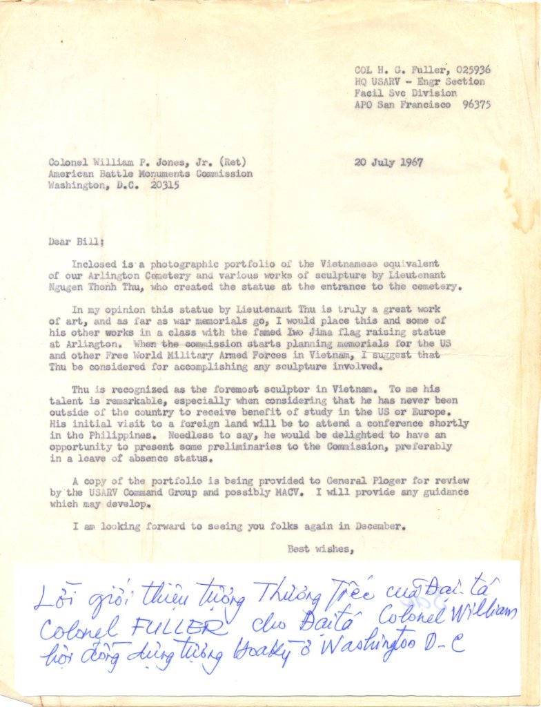 Điêu khắc gia, đại úy Nguyễn Thanh Thu (sinh năm 1934) là tác giả bức tượng “Trung liệt” đặt tại nghĩa trang quân đội Gò-Vấp. Ông được Tổng thống Nguyễn Văn Thiệu giao cho nhiệm vụ tạc bức tượng “Thương tiếc” ở nghĩa trang quân đội Biên-Hòa vào năm 1966 nhằm “nhắc nhở và giáo dục người dân về sự hy sinh cao quý của các chiến sĩ QLVNCH”. Ngoài ra, ông Thu cũng là tác giả của bức tượng “Ngày về”, được giải thưởng văn học nghệ thuật của chính phủ Ngô Đình Diệm vào năm 1963, tượng “Trần Nguyên Hãn” ở bùng binh chợ Bến-Thành, tượng “An Dương Vương” ở ngã sáu Chợ Lớn, tượng “Võ Trường Toản” đặt trong khuôn viên nhà trường và nhiều tác phẩm điêu khắc khác. Bức tượng “Quyết thắng” là tác phẩm sau cùng trong sự nghiệp sáng tác của ông được triển lãm tại công viên Đống-Đa, trước Tòa Đô Chánh vào năm 1969.