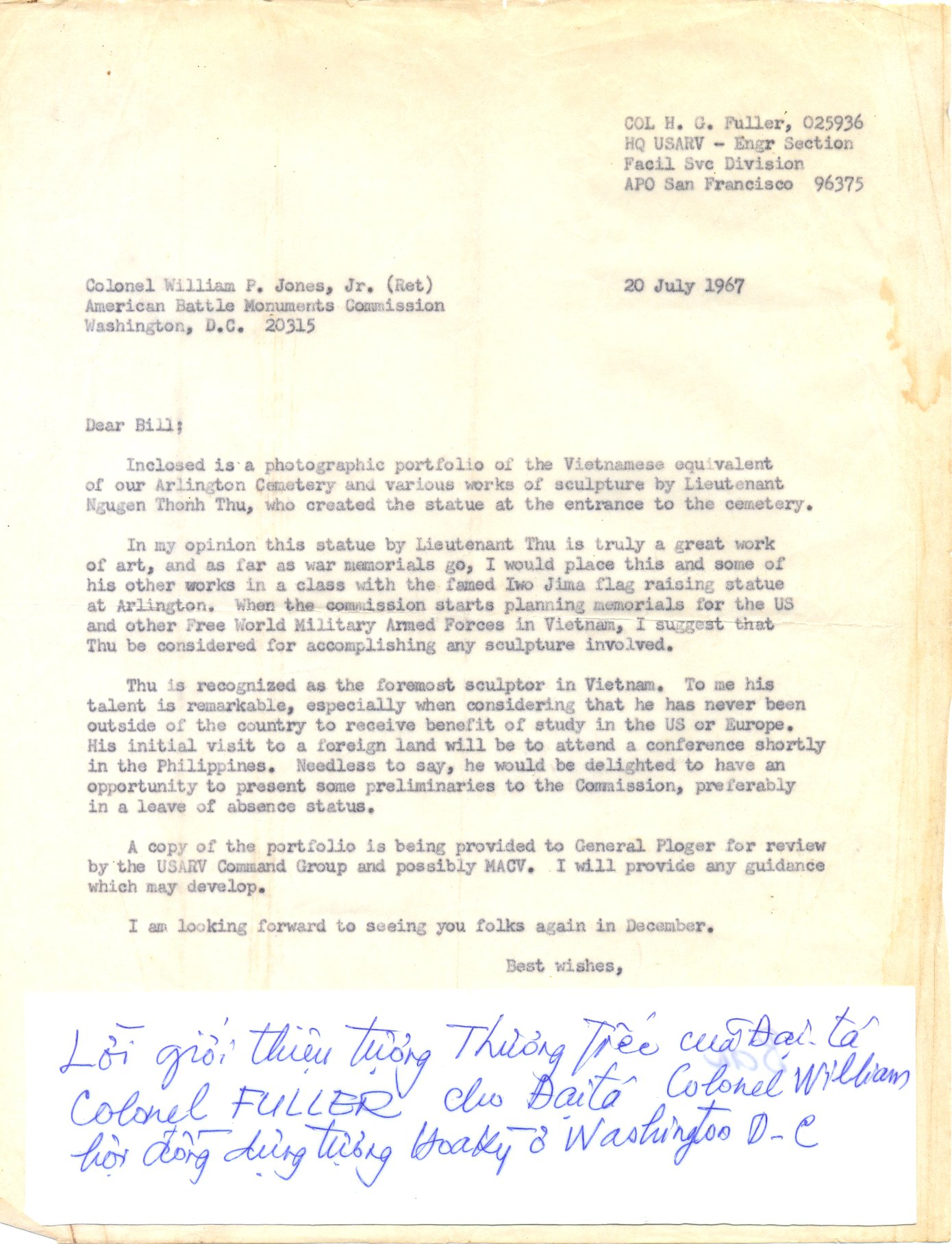 Đại tá William P. Jones – Chủ tịch Ủy ban Đài tưởng niệm chiến tranh Hoa-Kỳ hết lời ca ngợi ông Thu và các tác phẩm về đề tài chiến tranh như sau: “Xét về đề tài tượng đài chiến tranh, tôi trân trọng đặt tượng ‘Thương tiếc’ và các tác phẩm khác của ông ngang hàng với bức ảnh nổi tiếng ‘Raising The Flag on Iwo Jima’ ở Arlington”. Ông cũng tiến cử ông Thu với Ủy ban để thực hiện việc dựng tượng ở Hoa -Kỳ và các quốc gia đồng minh trong các dự án tương lai. Nhưng tiếc thay, miền Nam Việt-Nam bị bắc phương cưỡng chiếm vào ngày 30 tháng tư năm 1975, bức tượng “Thương tiếc” bị phá bỏ, những bức tượng trong sân nhà của ông cũng bị đập nát và thân phận của điêu khắc gia Nguyễn Thanh Thu phải lâm vào cảnh tội tù.