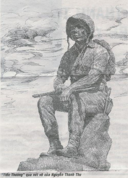 Tượng “Thương tiếc” được đặt trước cổng vào nghĩa trang quân đội ở Biên-Hòa, cách trung tâm Sài-Gòn khoảng 30 km. Bức tượng khắc họa hình ảnh người lính với gương mặt thẫn thờ ngồi trên tảng đá, quân phục và ba-lô trên người còn bám bụi sa trường, súng gác trên đùi, dây quai nón sắt buông thỏng và đôi mắt buồn bã đăm chiêu, như tiếc thương người bạn vừa nằm xuống nơi chiến trường xa. Ý tưởng này chợt đến khi ông Thu tình cờ nhìn thấy được trong một quán nước bên đường. Người lính thuộc binh chủng Nhảy dù, hạ sĩ Võ Văn Hai, rưng rưng ngấn lệ đang độc ẩm và tâm tình với người bạn đồng đội đã khuất. Hai ly bia trước mặt, “ly kia cho mày, ly này của tao”, hết vơi rồi lại đầy như tình chiến hữu không bao giờ phai lạt.