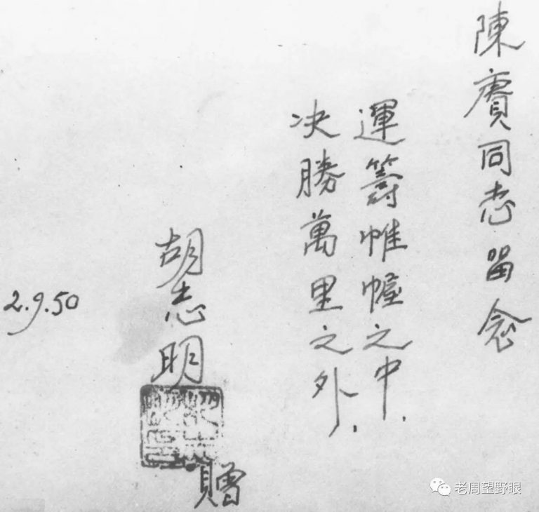 Hồ Chí Minh viết: Đồng chí Trần Canh lưu niệm vận trù chiến lược quyết thắng từ ngàn dặm (2.9,1950). Nguồn: http://www.sohu.com/a/129306381_556717 (胡志明题词:陈赓同志留念 运筹帷幄之中 决胜千里之外)