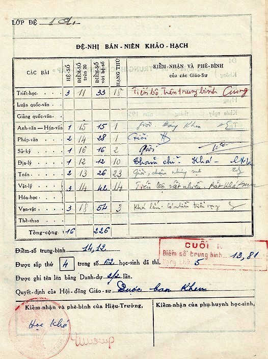 Ở bậc trung-học, tôi đã có cái may mắn lớn là được học suốt 7 năm (1953-1960) tại ngôi trường lớn và danh tiếng nhứt của Miền Nam: Trường Trung Học Petrus Trương Vĩnh Ký. Khi mới vào Trường thì tôi vẫn còn là một học sinh thường thường bực trung nhưng lên đến Lớp Đệ Tứ F (niên khóa 1956-1957) thì tôi đã trở nên một học sinh xuất sắc đứng đầu lớp như bảng điểm thi đệ nhứt bán niên sau đây cho thấy rất rõ: