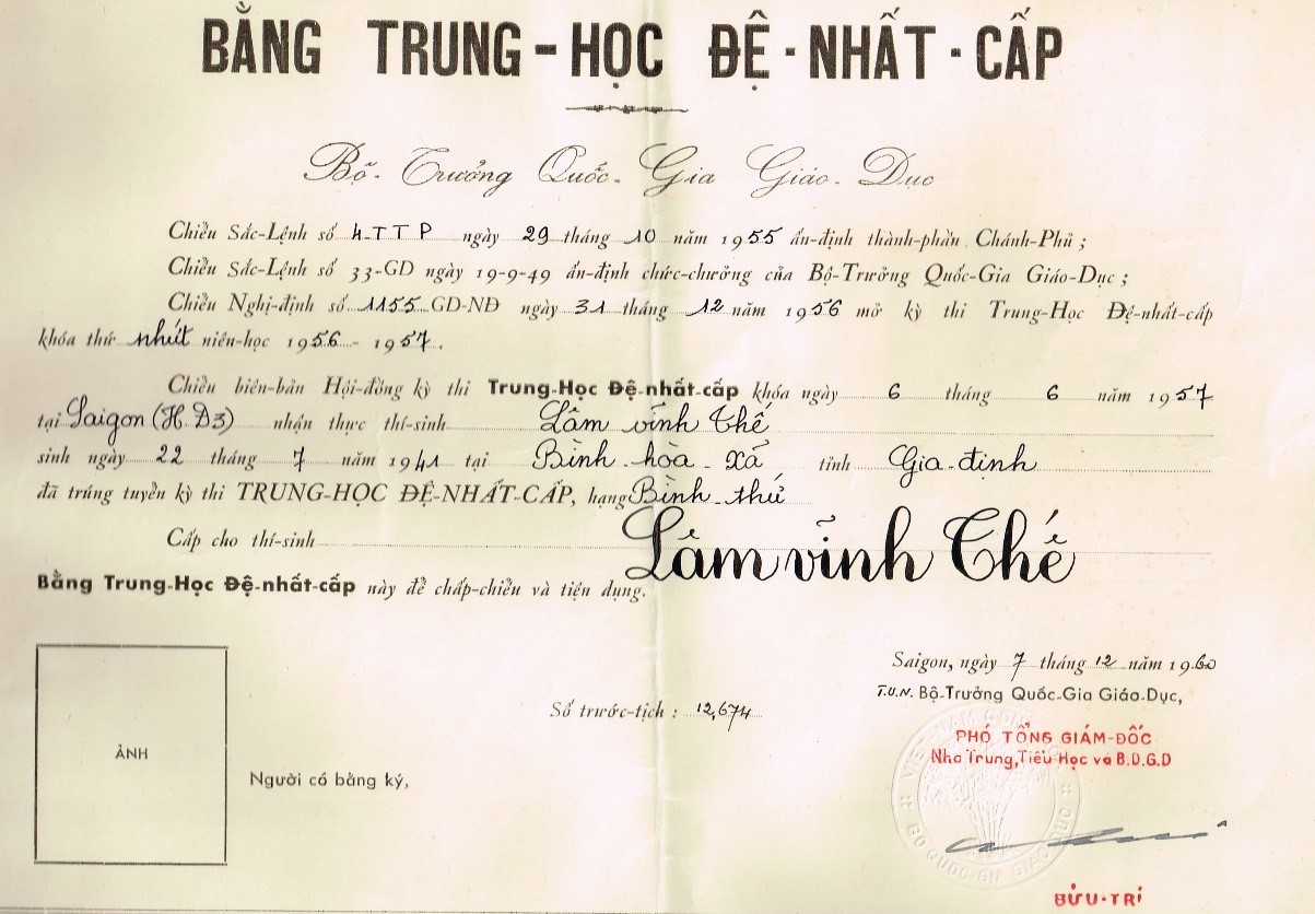 Cuối năm đó, tôi đã thi Bằng Trung Học Đệ Nhứt Cấp và đã được chấm đậu với Hạng Bình Thứ như trong tấm ảnh ngay bên dưới đây: