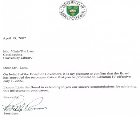 Nhờ vậy, tôi đã được thăng cấp lên bậc 4 (Librarian IV, là bậc cao nhứt cho các quản thủ thư viện đại học tại Canada và Hoa Kỳ) như trong văn thư chính thức sau đây của Tiến Sĩ Peter MacKinnon, Viện Trưởng, Viện Đại Học Saskatchewan: