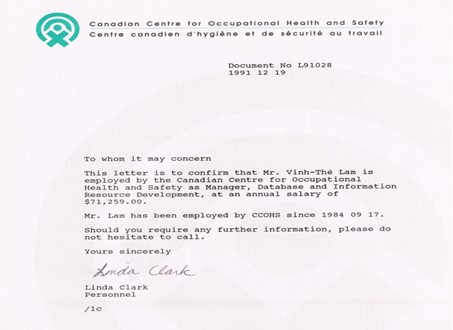 Giữa năm 1992, tôi đang làm việc cho một cơ quan của Chính phủ Canada tại thành phố Hamilton, thuộc tỉnh bang Ontario, có tên là Canadian Centre for Occupational Health and Safety, CCOHS = Centre canadien d’hygiène et de sécurité au travail, CCHST, với chức vụ là Manager, Department of Database and Information Resource Development.