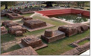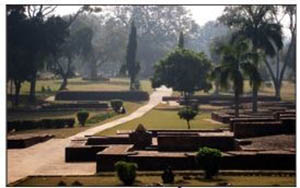 Rời Bồ Đề Đạo Tràng với bao luyến tiếc, Đoàn lên xe bus trở lại Varanashi. Thành phố Varanashi nằm bên bờ sông Hằng, đã có cách nay trên 5.000 năm, là thành phố xưa nhứt của nước Ấn Độ, hiện nay có khoảng 1.100.000 dân. Đoàn tới viếng di tích Nalanda University, thành lập vào khoảng Thế kỷ thứ 2 sau Tây lịch, cách Bồ Đề Đạo Tràng 62 cây số. Ngày xưa, đây là Trường Đại Học đầu tiên của thế giới, cũng là Đại Học vĩ đại nhứt vào thời đó. Trên một vùng đất rộng, xây nhiều công trình kiến trúc đồ sộ, với vô số phòng ốc, đủ chỗ cho 10.000 tăng sinh tu học, cùng với 2.000 giáo sư. Vua A Dục đã cho xây dựng nhiều tu viện, trong đó có một tu viện chánh Nalanda rất lớn gần đó. Vào đời nhà Đường, Thầy Huyền Trang từ Trung Quốc sang có đến ngụ một thời gian tại tu viện này cùng với hàng ngàn tăng sinh đến từ các nước Phật Giáo trên thế giới. Cũng từ Đại học Nalanda này, Ngài Huyền Trang đã thỉnh nhiều kinh sách Phật Giáo Đại Thừa đem về Trung Quốc. Đến cuối Thế kỷ thứ 7, quân Hồi Giáo từ Trung Đông qua tàn phá, chư tăng bỏ chạy lánh nạn, số chạy không kịp bị giết sạch. Thư viện bị đốt, cháy 6 tháng trời mới hết. Ngày nay, Đại Học Nalanda chỉ còn lại một số tường dày bằng đá ong, nhiều phòng ốc chỉ còn lại chân tường hơn ngàn năm nắng táp mưa sa… Khu Đại Học Nalanda xưa quá rộng, Đoàn chỉ viếng một vài phế tích đổ nát mà thôi.