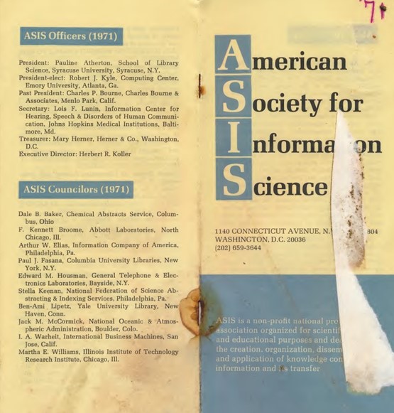 Lúc đó Giáo Sư Pauline Atherton đã là một khuôn mặt lớn trong ngành thư-viện-học và thông-tin-học tại Hoa Kỳ. Bà là đương kim Chủ Tịch Hội Thông-Tin-Học của Hoa Kỳ (American Society for Information Science = ASIS), nhiệm kỳ 1971, như thông tin từ tấm ảnh bên dưới đây: