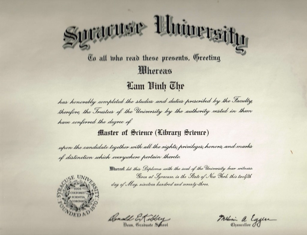 Văn Bằng Cao Học vê Thư-Viện-Học (Master of Library Science) do Trường Đại Học Syracuse, New York, Hoa Kỳ cấp cho tôi vào Ngày 12 Tháng 5 Năm 1973