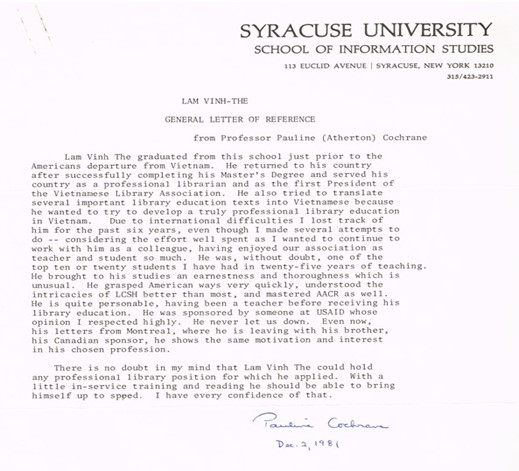 Trong thời gian gần 2 năm (từ tháng 9-1971 đến tháng 5-1973) theo học tại Trường Thư-Viện-Học của Viện Đại Học Syracuse (School of Library Science, Syracuse University), tôi đã có được cái duyên lành nhận được sự đào tạo của Giáo Sư Pauline Atherton (về sau, sau khi lập gia đình với Giáo Sư John Cochrane, bà đã đổi tên thành Pauline Atherton Cochrane, hay Pauline A. Cochrane).