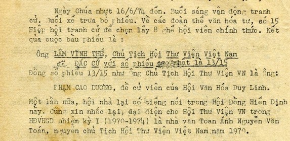 Sau khi về nước, vào đầu năm 1974, theo đề nghị của Anh Nguyễn Ứng Long, tôi đã ra ứng cử và đã đắc cử chức vụ Chủ Tịch Ban Chấp Hành Hội Thư Viện Việt Nam (HTVVN) cho nhiệm kỳ 1974.