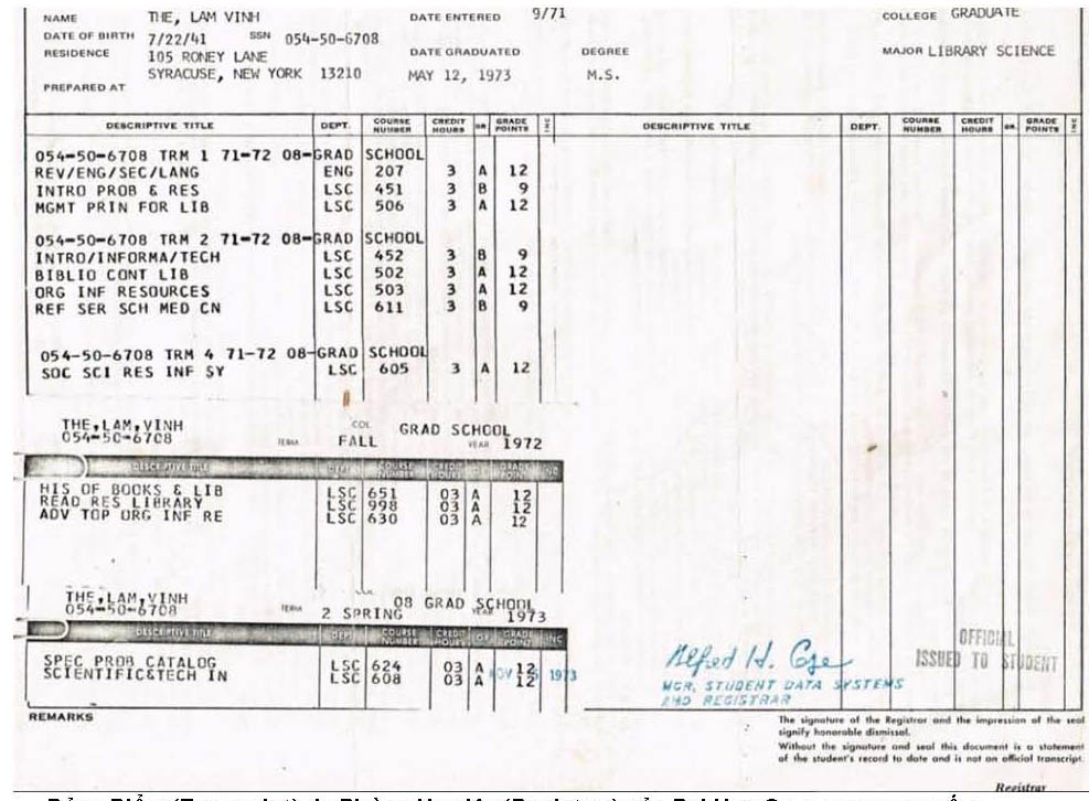 Bảng Điểm (Transcript) do Phòng Học Vụ (Registrar) của Đại Học Syracuse cung cấp