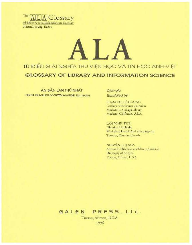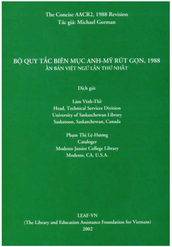 Vào đầu thập niên 1990, khi Liên Xô và khối Cộng Sản Đông Âu sụp đổ, Việt Nam bị buộc phải thay đổi chính sách để sống còn. Thủ Tướng Võ Văn Kiệt thực hiện chính sách “Đổi Mới,” tái lập bang giao với Hoa Kỳ, và kêu gọi sự đóng góp của giới trí thức Việt Nam tại hải ngoai. Nhóm cựu thành viên Ban Chấp Hành của Hội Thư Viện Việt Nam, nhiệm kỳ 1974-1975 (mà tôi là Chủ Tịch), sinh sống tại Hoa Kỳ, đã đáp ứng lời kêu gọi này. Nhóm thành lập một hội đoàn thiện nguyện có tên là Library and Education Assistance Foundation for Vietnam (LEAF-VN) = Hội Hỗ Trợ Giáo Dục và Thư Viện Việt Nam, với mục đích giúp phát triển hệ thống thư viện cho Việt Nam. Tôi đã tham gia vào hoạt động của nhóm. Chúng tôi tiến hành dịch hai tài liệu căn bản của ngành thư viện và thông tin học sang tiếng Việt: 1) ALA Từ điển giải nghĩa Thư viện học và Tin học Anh-Việt, do Nhà xuất bản Galen Press (Tucson, Arizona, Hoa Kỳ) xuất bản vào năm 1996, gồm 278 trang; nguyên tác tiếng Anh là ALA Glossary of Library and Information Science; và, 2) Bộ quy tắc biên mục Anh-Mỹ rút gọn, 1988, do Hội LEAF-VN xuất bản vào năm 2002, gồm 289 trang; nguyên tác tiếng Anh là The Concise AACR2, 1988 Revision. Cả 2 tài liệu này đều được gởi vể Việt Nam để biếu cho cộng đồng thư viện trong nước: