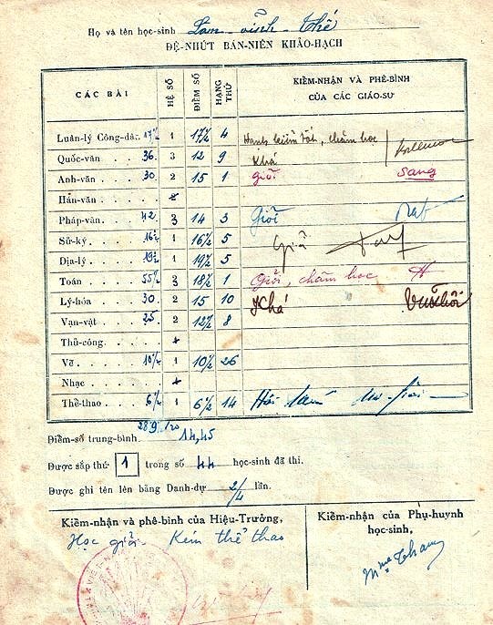 Bảng điểm thi Đệ Nhị Bán Niên Lớp Đệ Nhứt A1 (niên khóa 1959-1960)
