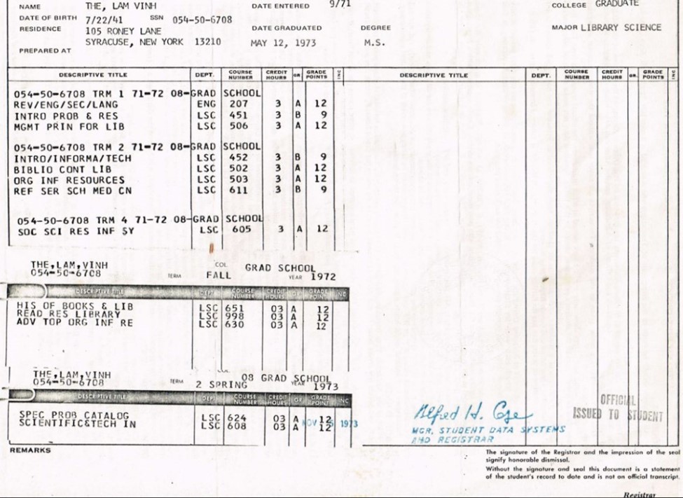 Tôi đã học tại Trường Thư Viện Học của Viện Đại Học Syracuse (School of Library Science, Syracuse University) trong một thời gian gần 2 năm, từ tháng 9-1971 cho đến giữa tháng 5-1973, và tốt nghiệp với Bằng Cao Học về Thư Viện Học (Master of Library Science – MLS). Khi mới vào học, mặc dù điểm TOEFL của tôi đã rất cao rồi, tôi vẫn được nhà trường khuyên nên lấy 1 giáo trình Anh ngữ về đàm thoại và tôi đã chấp hành nghiêm chỉnh, và cuối khóa tôi đã đạt được điểm A cho giáo trình đó. Hệ thống lượng giá thành tích học tập bằng điểm chữ của phần lớn các trường đại học (universities) hay cao đẳng (colleges) tại Hoa Kỳ là như sau:[8]