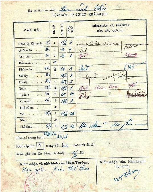Bảng điểm thi Đệ Nhị Bán Niên Lớp Đệ Nhứt A1 (niên khóa 1959-1960)