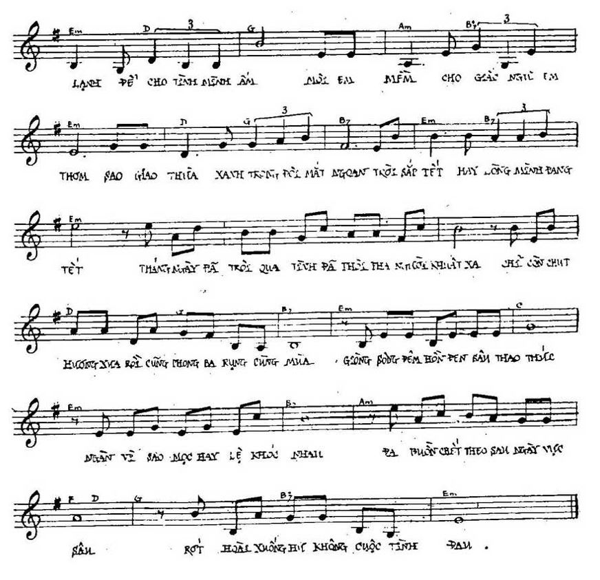 Em chợt đến vào đêm hôm trừ tịch, khi phút giao mùa rộn rã báo tin xuân. Còn đêm nào vui bằng đêm ba mươi, anh mừng hơn đứa trẻ nhỏ được mẹ cha mẹ sắm cho quần áo mới hay rủng rỉnh tiền lì xì. Em nhẹ nhàng như một áng mây. Em là thiên thần hiển hiện giữa cuộc đời nhiều giông bão này. Không giàu bạc tiền nhưng trái tim chung tình này chỉ dành riêng cho em đó. Chiếc lá vàng rụng rơi cuối ngõ như một chứng nhân cho tấm lòng chân thật yêu em.
