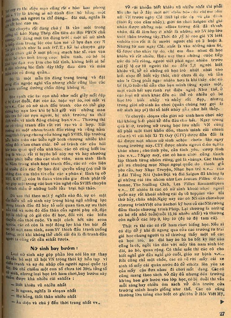 | Thật hạnh phúc cho tôi khi vừa được bạn Võ Phi Hùng, một đồng môn CHS PetrusKy tặng bản copy bộ tuần báo Đời cũ, gồm 147 số báo ra trong quãng 1969-1972. Ở Sài Gòn và cả nước thời thập niên 60 cho đến ngày 30-4-75, ‘Chu Tử và nhóm Sống’ được coi là nhóm báo chí chuyên nghiệp đứng đầu cả nước về nghiệp vụ cùng thực lực với một lô tuần báo là Đời, Nạng Thép, Quyết Sống và Tin Vịt cùng 2 nhật báo Sống và Sóng Thần. Riêng về tuần báo Đời (1969-1972), là nơi tôi tập tễnh vào nghề báo rồi may mắn được học nghề với những nhà báo, nhà thơ, nhà văn, họa sĩ lão luyện như: Chu Tử, Đỗ Qúy Toàn (thư ký tòa soạn), Hoàng Hải Thủy, Uyên Thao, Lữ Hồ, Đằng Giao, Cung Tích Biền, Tê Đê.v.v… Điển hình như từ cái lệ riêng của tuần báo Đời là ngoài các mục thường xuyên thì bài vở cốt cán mở đầu mỗi số báo đều tập trung vào một chủ đề thời sự đang nóng (hot) trong nước. Và ĐỜI số 76, ra ngày 8/4/1971 đã chọn chủ đề ‘Nữ sinh Sài Gòn’, trong đó tòa soạn đã thử thách (trong nghề gọi là ‘nắn gân’) tên ký giả non trẻ bằng cách giao viết một trong những bài chính yếu của chủ đề, đó là một ký sự nhất định phải dài, đòi hỏi người viết phải đi nhiều, phải tiếp xúc, nghe ngóng nhiều nguồn tin để thu lượm tư liệu, số liệu… (PN) |