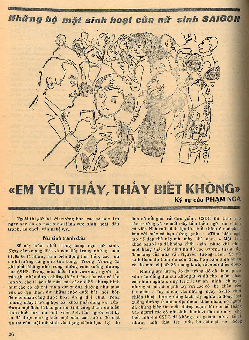 | Thật hạnh phúc cho tôi khi vừa được bạn Võ Phi Hùng, một đồng môn CHS PetrusKy tặng bản copy bộ tuần báo Đời cũ, gồm 147 số báo ra trong quãng 1969-1972. Ở Sài Gòn và cả nước thời thập niên 60 cho đến ngày 30-4-75, ‘Chu Tử và nhóm Sống’ được coi là nhóm báo chí chuyên nghiệp đứng đầu cả nước về nghiệp vụ cùng thực lực với một lô tuần báo là Đời, Nạng Thép, Quyết Sống và Tin Vịt cùng 2 nhật báo Sống và Sóng Thần. Riêng về tuần báo Đời (1969-1972), là nơi tôi tập tễnh vào nghề báo rồi may mắn được học nghề với những nhà báo, nhà thơ, nhà văn, họa sĩ lão luyện như: Chu Tử, Đỗ Qúy Toàn (thư ký tòa soạn), Hoàng Hải Thủy, Uyên Thao, Lữ Hồ, Đằng Giao, Cung Tích Biền, Tê Đê.v.v… Điển hình như từ cái lệ riêng của tuần báo Đời là ngoài các mục thường xuyên thì bài vở cốt cán mở đầu mỗi số báo đều tập trung vào một chủ đề thời sự đang nóng (hot) trong nước. Và ĐỜI số 76, ra ngày 8/4/1971 đã chọn chủ đề ‘Nữ sinh Sài Gòn’, trong đó tòa soạn đã thử thách (trong nghề gọi là ‘nắn gân’) tên ký giả non trẻ bằng cách giao viết một trong những bài chính yếu của chủ đề, đó là một ký sự nhất định phải dài, đòi hỏi người viết phải đi nhiều, phải tiếp xúc, nghe ngóng nhiều nguồn tin để thu lượm tư liệu, số liệu… (PN) |