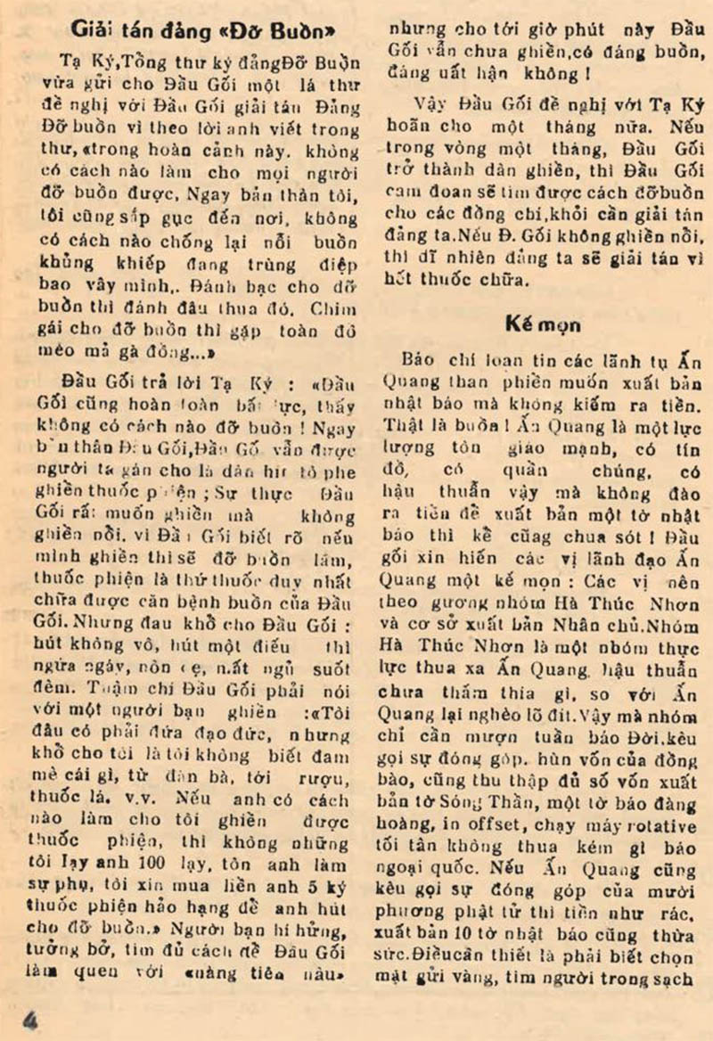 Giải tán đảng “Đở buồn” Đầu Gối (nguồn: tuần báo Đời số 124, ngày 23-03-1972 – trong trang “Nói chuyện với đầu gối” của Kha Trấn Ác – Chu Tử) Share this: Click to share on X (Opens in new window) X Click to share on Facebook (Opens in new window) Facebook Like Loading...