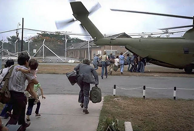 Ba mươi năm sau, giai điệu ấy lại vang lên trong một bối cảnh hoàn toàn khác: Sài Gòn cuối tháng 4 năm 1975. Quân CS Bắc Việt đang tiến vào thủ đô, hàng ngàn người Mỹ, nhân viên sứ quán và một số người Việt cộng tác với Hoa Kỳ chuẩn bị rời đi. Các cơ quan Hoa Kỳ tại Việt Nam triển khai chiến dịch “Operation Frequent Wind”, chiến dịch di tản khẩn cấp bằng trực thăng ra tàu hải quân. Để báo hiệu cho những người Mỹ và người Việt cần di tản mà không gây hoảng loạn, Đài Phát thanh Quân đội Hoa Kỳ (AFVN) sử dụng các bản nhạc nổi tiếng làm mật hiệu, trong đó có “White Christmas” của Bing Crosby.