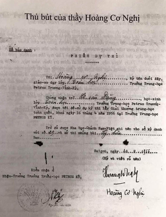 Giấy giới thiệu của hai thầy Hoàng Cơ Nghị và Nghiêm Xuân Thiện cho trò Lê Văn Đặng tham dự kỳ thi lấy giải thưởng Lý Hóa, Toán học của các trường Trung học toàn quốc ngày 16-4-1956 (Nguồn: GS Lê Văn Đặng, GS Toán Petrus Ký) Share this: Click to share on X (Opens in new window) X Click to share on Facebook (Opens in new window) Facebook Like Loading...