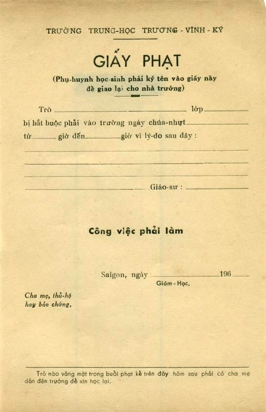 Giấy Phạt Trường Trung học P. Trương Vĩnh Ký (Nguồn: Trần Hữu Hiệp – PK 1974-81) Share this: Share on X (Opens in new window) X Share on Facebook (Opens in new window) Facebook Like Loading...