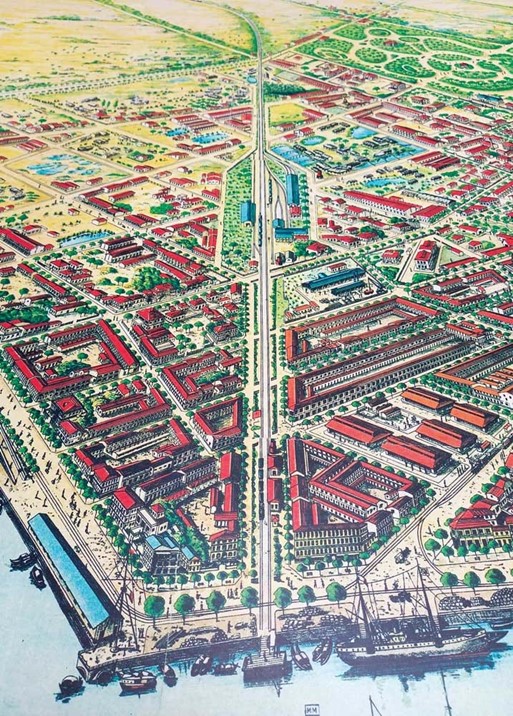 Trên bản vẽ phối cảnh quy hoạch thành phố năm 1880, ở nhà máy Ba Son đã xuất hiện một ụ tàu nổi đồ sộ, trong thực tế được nhập khẩu từ Anh. Kế đến, đối diện với các bến tàu là dãy nhà phố ba hoặc bốn tầng, lợp ngói đỏ, trải dài không khác gì phố phường ven cảng Marseilles.