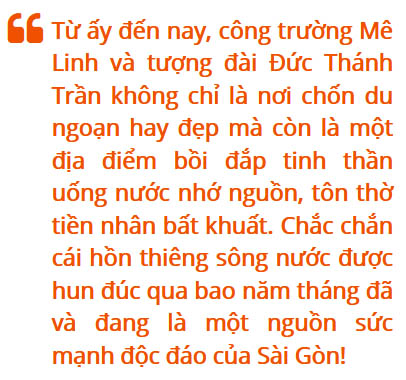 Hơn thế nữa, tượng đài cùng với chiếc lư hương uy nghi phía trước, được tạo dáng như một chiến hạm dũng mãnh, đã tạo ra ấn tượng lớn về lịch sử Việt Nam trong lòng nhiều thế hệ người dân và du khách. Từ ấy đến nay, công trường Mê Linh và tượng đài Đức Thánh Trần không chỉ là nơi chốn du ngoạn hay đẹp mà còn là một địa điểm bồi đắp tinh thần uống nước nhớ nguồn, tôn thờ tiền nhân bất khuất. Chắc chắn cái hồn thiêng sông nước được hun đúc qua bao năm tháng đã và đang là một nguồn sức mạnh độc đáo của Sài Gòn!