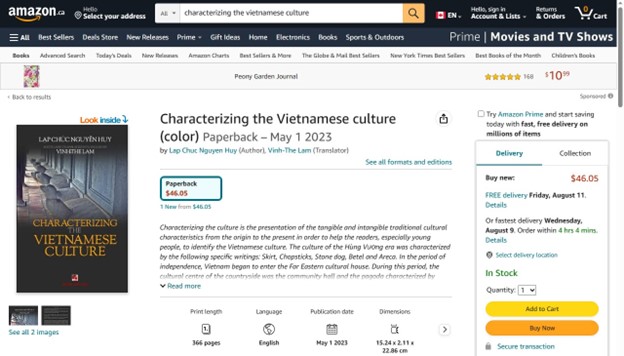 Characterizing the Vietnamese culture is the presentation of the tangible and intangible traditional cultural characteristics from the origin to the present in order to help the readers, especially the young people, to identify the Vietnamese culture. The culture of the Hùng Vương era was characterized by the following specific writings: Skirts, Chopsticks, Stone Dog, Betel and Areca. In the period of independence, Vietnam began to enter the Far Eastern cultural house. During this period, the cultural centre of the countryside was the community hall (Đình) and the pagoda characterized by Village Meal, the “Nghê”, while the national cultural centre was the capital city of Thăng Long characterized by the following specific writings: Tết, Tết Pole, Tết Meal, Ancestral Altar, Ancestral Worshipping. Huế is the symbol of the summit of the traditional culture reflected by the following specific writings: Educational Philosophy of the Nguyễn Emperors, Royal Meal, Origin of The Traditional Robe (Áo Dài), The Palm-leafed Conic Hat (Nón Lá), The Culture in The Traditional House, and Cây Kiểng (Vietnamese Bonsai).