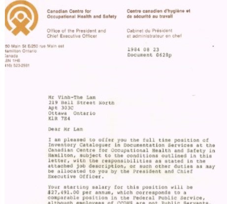 Tôi gởi đơn ngay xin được tuyển dụng vào chức vụ Inventory Cataloguer. Ngày 7-8-1984, tôi nhận được văn thư của CCOHS mời tôi đến trụ sở của cơ quan ở Hamilton để được phỏng vấn vào ngày 15-8-1984. Ngày 23-8-1984, CCOHS gửi văn thư chính thức báo tin là họ nhận tôi làm Inventory Cataloguer cho Documentation Services với lương năm là 27.491 đô la. Đây là một công việc toàn thời gian, thường trực, với rất nhiều quyền lợi giống như một công chức của chính phủ liên bang Canada. Không còn nghi ngờ gì nữa cả, tôi đã thật sự được Canada chính thức công nhận là một chuyên viên về thông tin thư viện.” [3]