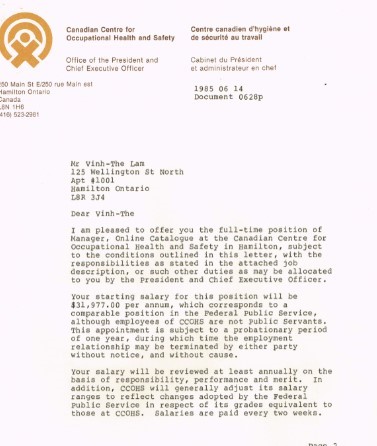 “Tôi chính thức bắt đầu làm việc tại CCOHS vào ngày 17-9-1984. Tám tháng sau, vào đầu tháng 4-1985, CCOHS lại đăng báo mở lại cuộc thi tuyển chức vụ Trưởng Ban Thư Mục Trực Tuyến (Manager, Online Catalogue) mà năm trước họ đã không tuyển được. Lần này, tôi đã nộp đơn xin dự thi, được phỏng vấn vào ngày Thứ Hai, 10-6-1985, và ngày 14-6-1985, tôi nhận được văn thư của CCOHS báo tin cho hay tôi đã trúng tuyển, và ngày 24-6-1985 tôi chính thức bắt đầu nhận nhiệm vụ Trưởng Ban Thư Mục Trực Tuyến này.” [4]
