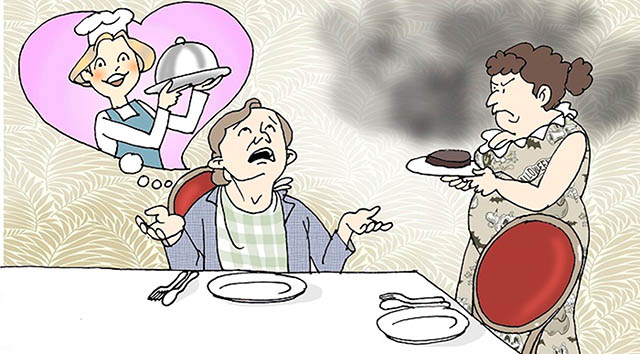 Rồi hôm Chủ Nhật, tui gặp Harry ở nhà thờ. Tui thấy nó cúi đầu rất thành kính lâm râm cầu nguyện Thượng đế. Tan lễ, tui hỏi: “Sao chú mầy cầu nguyện có vẻ thành kính đến thế? Bộ chú mầy sợ Cha xứ hổng biết nấu ăn hay sao?” Nó nói: “Ðâu có! Cha xứ đâu có ‘lan can’ vô chuyện nầy! Sau bữa ăn tối đó, con vợ tao nổi lên một bồ tự ái nên nó đã bỏ tao đi lấy chồng khác rồi.” “Bữa nay tao cầu nguyện để mong con nhỏ ‘chef cook’ ở nhà hàng 5 sao chấp thuận lời cầu hôn của tao!”