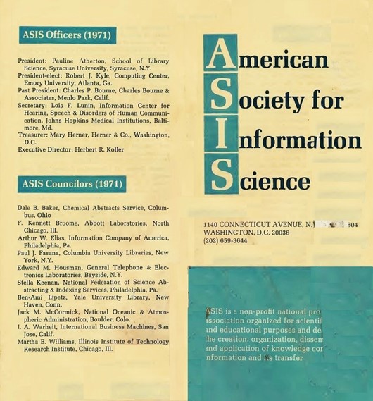 Vào khoảng thời gian này, Giáo sư Pauline Atherton đã là một tên tuổi lớn trong ngành thư viện – thông tin học tại Hoa Kỳ và trên thế giới. Bà là đương kim Chủ Tịch, Hội Thông Tin Học của Hoa Kỳ nhiệm kỳ 1971 (President, American Society for Information Science = ASIS) như thông tin trong tấm ảnh bên dưới đây đã ghi rõ: