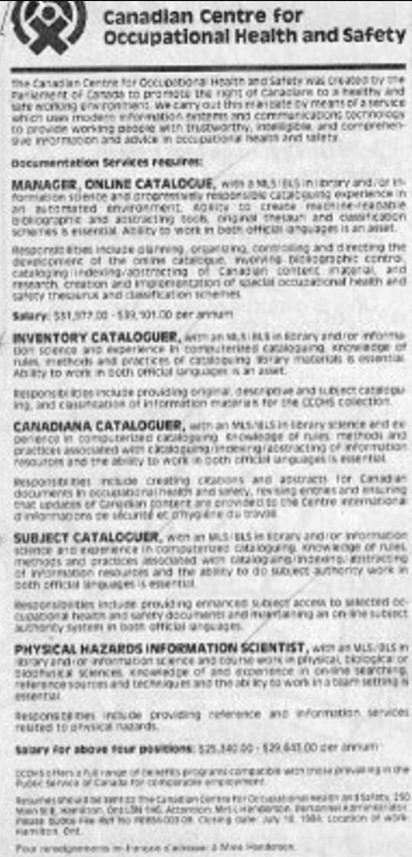 Tháng 7-1984, một hôm đọc báo The Globe and Mail tôi thấy đăng một mẫu thông báo khá dài của một cơ quan có tên là Canadian Centre for Occupational Health and Safety (thường được viết tắt là CCOHS; tên tiếng Pháp của cơ quan là Centre canadien d’hygiène et de sécurité au travail, viết tắt là CCHST; đây là trung tâm quốc gia của Canada phụ trách thông tin về An Toàn Lao Động) cho biết là họ đang tuyển 5 nhân viên cùng một lúc, một trường hợp khá hiếm, đặc biệt là trong đó có đến 4 nhân viên về ngành Biên Mục (Cataloging), gồm 1 Chức vụ Trưởng Ban, Thư Mục Trực Tuyến (Manager, Online Catalogue), và 3 Biên Mục Viên, 1 Inventory Cataloguer, 1 Canadiana Cataloguer, và 1 Subject Cataloguer. Đây quả thật là một cơ hội quá tốt mà tôi đã trông chờ từ bao lâu nay. Tôi quyết định nộp đơn xin việc ngay, và, tự xét mình chỉ là một người di dân, chưa có quốc tịch Canada, và mới sống ở Canada chưa được tới 3 năm, trong đơn tôi nói rõ chỉ xin ứng tuyển cái công việc thấp nhứt là Inventory Cataloguer mà thôi.