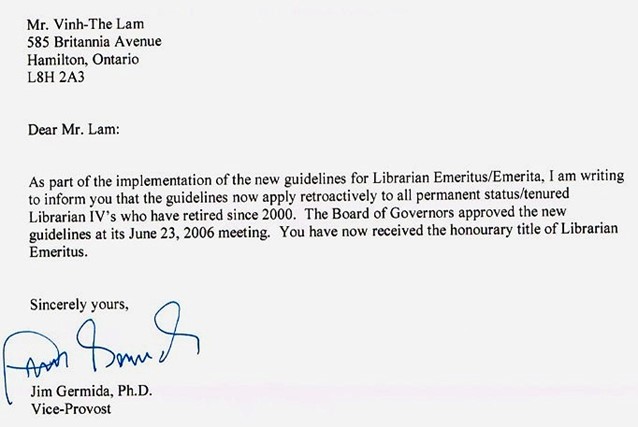 Hội Đồng Quản Trị của Đại Học Saskatchewan ban cho Danh hiệu Librarian Emeritus.