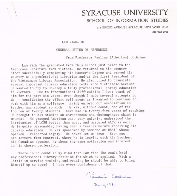 Sau khi đọc hồ sơ của tôi do Cơ Quan USAID chuyển lên cho Đại Học Syracuse, Ân Sư Pauline Atherton biết rõ là, sau khi tốt nghiệp về nước, tôi sẽ có nhiệm vụ thành lập Ban Thư Viện Học đầu tiên cho Việt Nam Cộng Hòa (VNCH). Do đó, Bà đã quyết định không phải chỉ đào tạo tôi thành một Quản Thủ Thư Viện chuyên nghiệp mà còn là một Giáo sư về ngành Thư Viện Học. Bà hỏi tôi thích dạy về bộ môn nào và tôi nói ngay là tôi rất thích giảng day môn Biên Mục là ngành chuyên môn của Bà. Và trên thực tế tôi đã theo học tất cả 3 giáo trình về Biên Mục là: 1) Organization of Information Resources, LSC 503; 2) Special Problems in Cataloging, LSC 624; và, 3) Advanced Topics in Organization of Information Resources, LSC 630. Hai giáo trình LSC 503 và LSC 630 đều do chính Bà giảng dạy. Tháng 5-1973, tôi tốt nghiệp với bằng Cao Học về Thư Viện Học (Master of Library Science = MLS) và lên đường về nước.