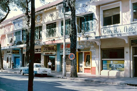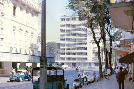 Nơi trung tâm nổi tiếng nhất Sài Gòn ở góc Lê Lợi, Tự Do. Bên trái là Continental Palace, phía xa là Caravelle Hotel, bên phải là cư xá Eden.