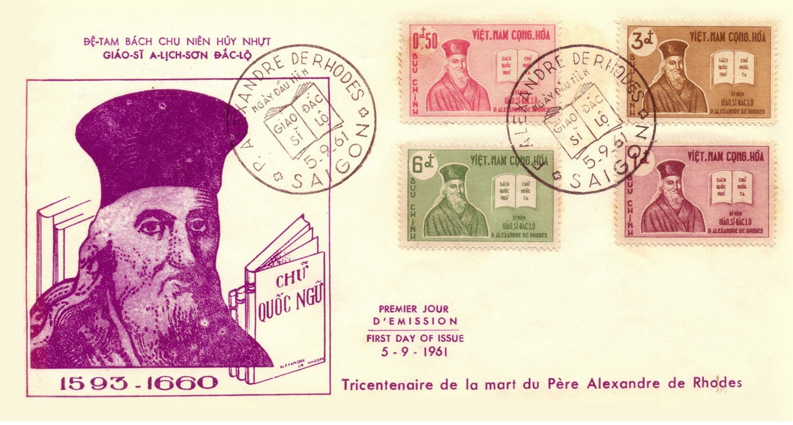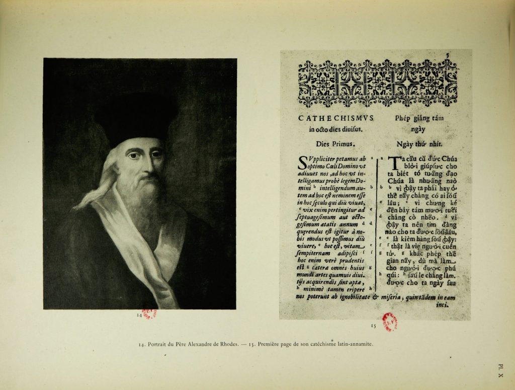 In 1651, the Dictionarium Annamiticum, Lusitanum et Latinum (Annamese–Portuguese–Latin Dictionary) and Phép giảng tám ngày cho kẻ muốn chịu phép rửa tội mà vào đạo thánh Đức Chúa Trời (Eight-Day Catechism for Those Who Wish to Receive Baptism and Enter the Holy Religion of God) were published in Rome. The author of these two publications was clearly stated on the cover as Alexandre de Rhodes. These were the first two publications in Quốc Ngữ, making them important milestones in understanding the history of this script. Therefore, when Quốc Ngữ became widely popular throughout Vietnam in the early 20th century, gradually replacing Classical Chinese and Nôm, Father Alexandre de Rhodes was credited with originating the Latin script for recording the Vietnamese language. It’s also possible that for political reasons, the French colonial government in Indochina at the time attributed primary credit to him for creating Quốc Ngữ, considering him its father.