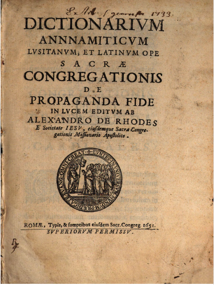 The dictionary (O’NEILL Charles E. & DOMÍNGUEZ Joaquín M. (Eds), 2001, page 96) states that Father Gaspar do Amaral was born in 1594 in Portugal and died due to a shipwreck off Hainan Island on February 26, 1646. He was sent by the Jesuits to Macao in 1623. From Macao, he went to Đàng Ngoài several times, first in October 1629. He contributed to compiling the Vietnamese–Portuguese–Latin dictionary (Diccionário anamita-português-latim), in addition to a handwritten document in Portuguese from 1632, which contained many chữ Quốc Ngữ words (ĐỖ Quang Chính, 1972). This dictionary is now lost. However, Father Đắc Lộ’s dictionary (see section I.2 above and II.1.2 below) states that he inherited from that work.