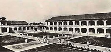 Sân Trường Petrus Ký – Ảnh chụp khoảng thập niên 1920 – Dãy nhà trệt là khu vực Phòng Thí Nghiệm – Dãy nhà lầu một từng là các phòng học