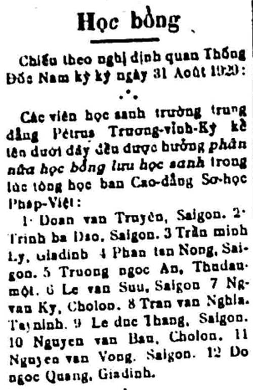 Số báo Đuốc Nhà Nam ngày 7-9-1929 cho biết nghị định của Thống đốc Nam kỳ ký ngày 31-8-1929 đã cấp các học bổng bán phần và toàn phần cho học sanh Petrus Ký của hai ban Cao đẳng Sơ học Pháp Việt và Trung đẳng.
