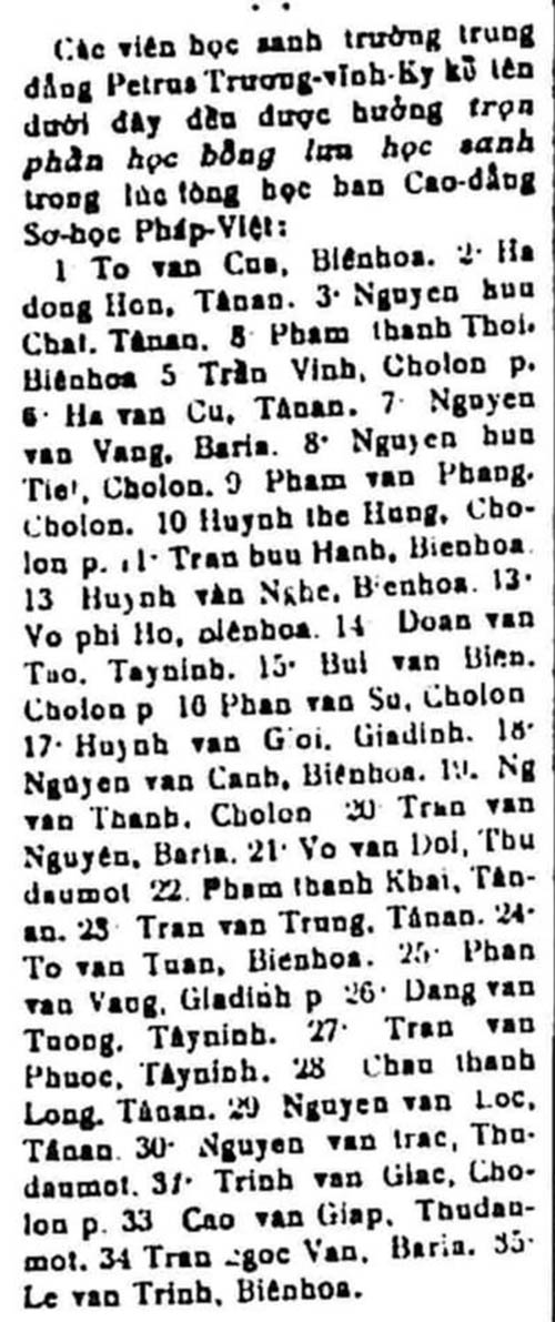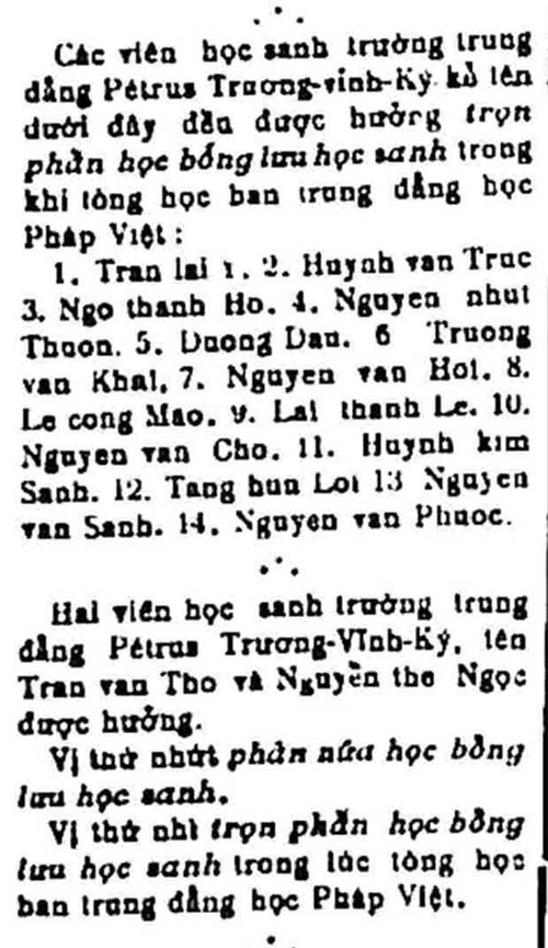 Trường Cần Thơ (Phan Thanh Giản): (2) phân nữa học bổng cho lưu học sanh ban Sơ Học Thượng Đẳng Pháp Việt và (24) toàn phần học bổng ban SHTĐPV.