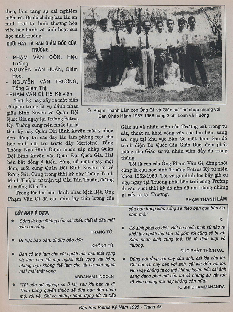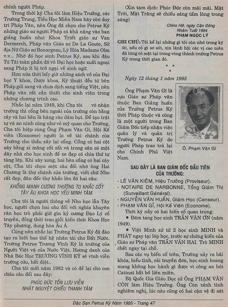 Hồi ký của bà Phạm Ngọc Lý, ái nữ cựu Hiệu trưởng Phạm Văn Còn, nguyên Giáo sư và Hiệu trưởng trường Petrus Trương Vĩnh Ký và hồi ký của Phạm Thanh Lâm, Thú nam Ông Phạm Văn Gĩ, Hội kế viên trường Petrus Ký. (Nguồn: Đặc san Petrus Ký Nam Cali 1995) Share this: Click to share on X (Opens in new window) X Click to share on Facebook (Opens in new window) Facebook Like Loading...