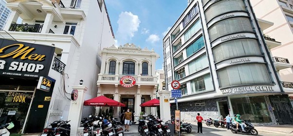 Bên ngoài quán cà phê Highlands ở một ngôi nhà cổ trên Bến Vân Đồn (quận 4, TP.HCM).