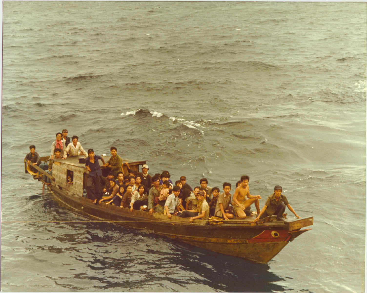 Hai ngày đêm lênh đênh trên biển, chiếc ghe đầy ắp người phải căng buồm xuôi theo hướng gió vì máy tàu bị hư. Biết đi về đâu giữa mênh mông sóng nước khi bến bờ trước mắt chỉ là cõi mịt mờ, vô vọng. Nắng ban mai chưa kịp xua hết mớ sương mù nơi miền biển vắng vẻ thì trước mắt mọi người sừng sững chiếc tàu đánh cá khổng lồ với lá cờ của vương quốc Thái-Lan phất phơ trong gió sớm. Họ nối chiếc ghe sông rạch nhỏ bé vào chiếc tàu đánh cá bằng một sợi dây thừng to bản. Sau cái màn “xin xỏ” lẫn cướp bóc, đàn bà và con nít được lùa hết qua tàu lớn. Đám đàn ông phải ở lại trên ghe và được kéo theo sau chiếc tàu hùng vĩ giữa những cơn sóng ba đào. Giữa trưa, một tên trong đám ngư phủ từ trên chiếc tàu lớn cầm trong tay con dao bén ngót và ra dấu sẽ cắt đứt sợi dây thừng khi ráng chiều ngả bóng!