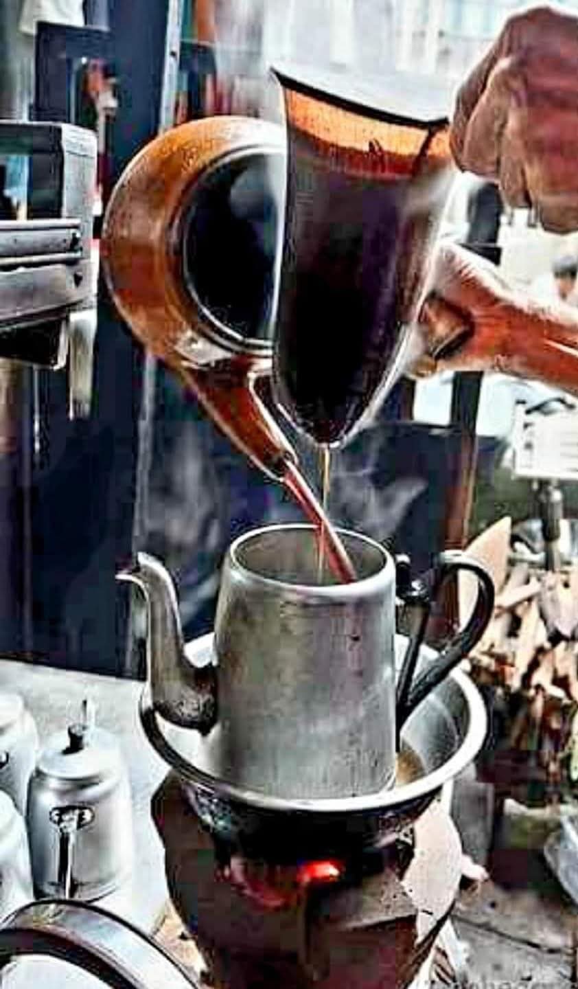 Ngày đó, ở các tiệm nước (tên thường gọi của các quán ăn ngày xưa) hay quán cà-phê thường pha cà-phê bằng cách cho cà-phê đã xay nhuyễn vào cái vợt bằng vải với một liều lượng nhất định. Họ nhúng ngập cái vợt vào nước sôi đựng trong cái ấm bằng nhôm ốm ốm, cao cao hay cái nồi bằng sành giống như cái siêu sắc thuốc để tận dụng hết chất đậm đặc, chất đắng của mớ cà-phê mịn. Cà-phê bán cho khách được rót ra từ cái vòi của bình và được pha chế sau đó tùy theo “gu” của khách hàng.
