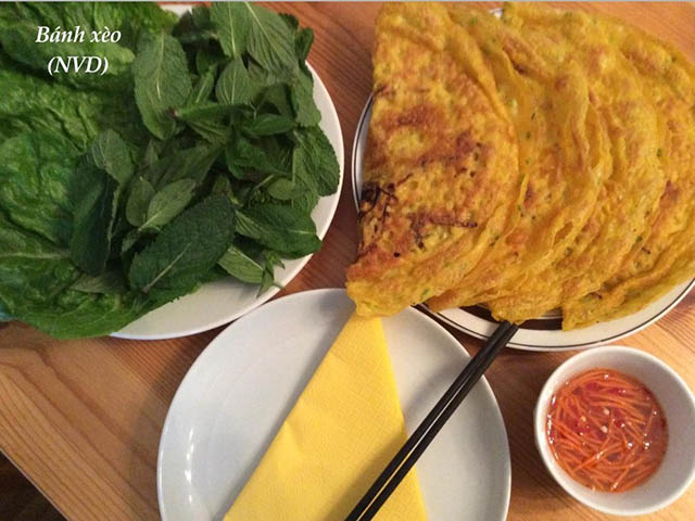 Khi đó, nhà tôi còn nấu nướng bằng than củi. Mỗi lần đổ bánh xèo, dì tôi đem ông táo ra sân, chụm lửa và đổ bánh bằng chảo lớn. Đợi khi chảo nóng, dì tôi cho vô một ít dầu ăn, vài con tép sống, vài lát thịt ba rọi mỏng te và hành tây xắt sợi, đảo sơ. Xong, dì múc một vá bột, đổ cái “xèo”vô chảo! Rồi dì lẹ tay lắc chảo tráng cho bột giàn đều, rắc một nhúm đậu xanh không vỏ đã nấu chín lên mặt bánh, thêm một nhúm giá sống, đậy nắp lại. Sau vài phút, mở nắp ra. Cái bánh trở màu vàng ươm, phập phồng, thơm tho hương nước cốt dừa. Dì tôi lấy sạn, gấp bánh lại, xúc ra, bày lên dĩa lớn, lót một miếng lá chuối cho bánh khỏi dính vô nhau. Bột bánh xèo pha khéo, khi tráng, rìa bánh giòn rụm, lòng bánh mềm mại, không nhão, và nhưn giá không nhũn. Bánh xèo miền Nam được cuốn với xà-lách và rau sống đủ loại, chấm nước mắm chua ngọt, bỏ thêm một ít cà-rốt và củ cải trắng xắt sợi ngâm giấm đường.