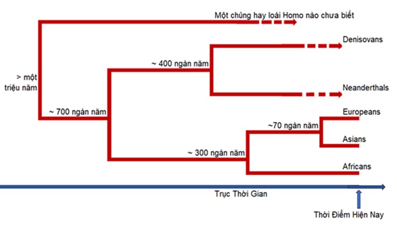 2) Về So sánh bộ gen của người hiện đại, người Neanderthal người Denisovans. Để tìm ra mối liên hệ giữa ba nhóm người này trong thời tiền sử, sự dịch chuyển địa lý của họ. Thực ra về tiến hoá học, khoa học đã dùng các phương pháp so sánh cấu trúc bộ xương phối hợp với đồng vị phóng xạ xác định niên đại đã thiết lập được những căn bản của mối liên hệ đó. Ý nghĩa của công trình của ông Svante Pääbo là sự so sánh bộ gen của các nhóm người đã khẳng định thêm giả thuyết đi từ các phương pháp so sánh trước đó, đồng thời bổ sung thêm một vài khoảng trống các nhà khoa học còn đặt dấu hỏi. Dựa trên các tài liệu tham khảo khác nhau (trong số đó, dễ đọc nhất là bài báo (4) trong mục tham khảo bên dưới), bài viết này xin diễn tả mối quan hệ ấy bằng sơ đồ dưới đây dưới dạng cây phả hệ phát sinh.