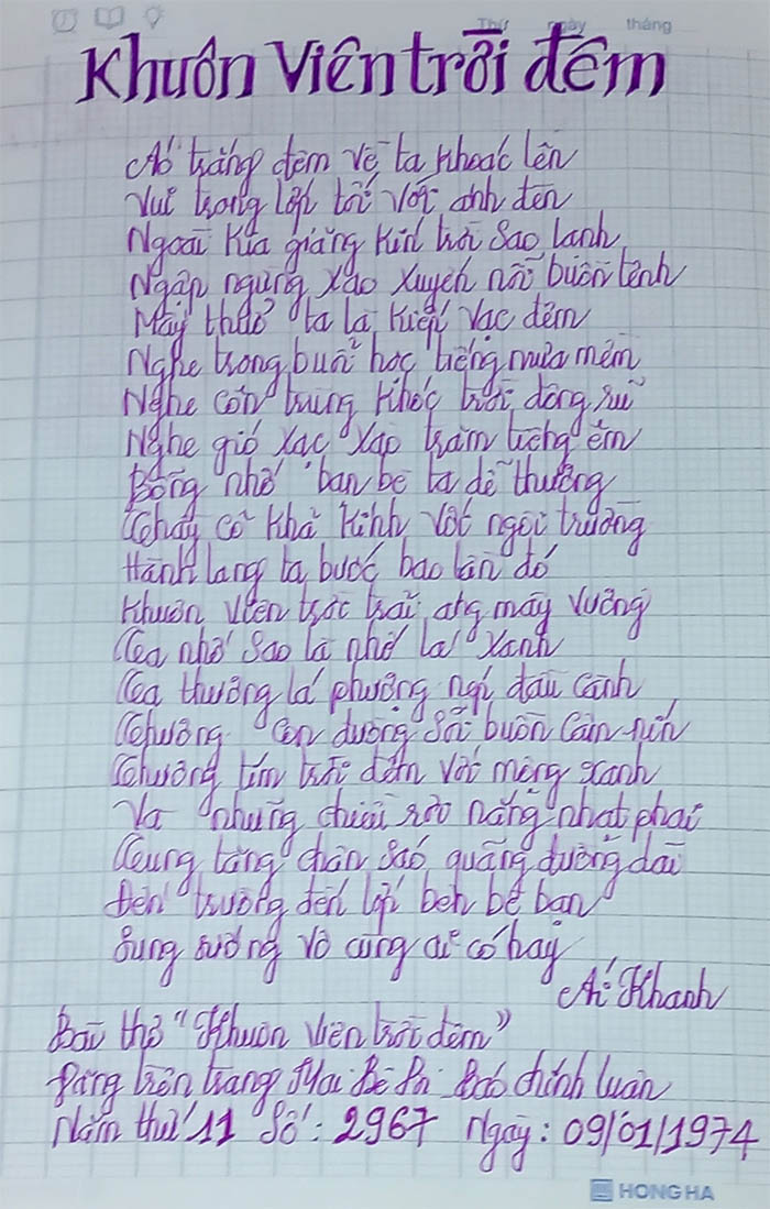 Là học trò lớp đêm chỉ thấy nắng chiều và bóng đêm, không gian và thời gian ấy làm cô học trò nhỏ mang tâm hồn đa cảm lãng mạn viết nên những bài thơ vụng dại tuổi học trò dưới mái trường Petrus Ký yêu dấu từ Niên khóa 1969 (vào học năm lớp đệ lục) đến ngày 30.4.1975.