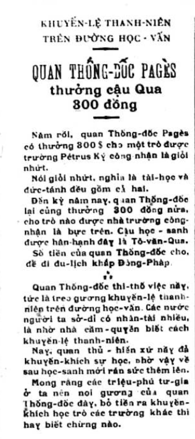 Theo một bản tin trên tờ Lục Tỉnh tân văn số 5013, ngày 5-7-1935 thì trò Tô Văn Qua, một học sinh Petrus Ký giỏi nhất về học lực và đức hạnh đã được ông Thống đốc Nam Kỳ Pagès khen thưởng với số tiền 300 đồng để đi du lịch khắp Đông dương.