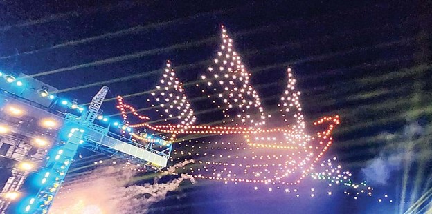 Và thêm nữa, hàng trăm nhân viên kỹ thuật, hướng dẫn viên và bảo vệ hùng hậu làm việc cật lực từ hơn mấy tháng trước. Tất cả cùng làm nên một “dạ tiệc” thịnh soạn của diễn xuất, ca vũ, âm nhạc, ánh sáng, mô hình, đạo cụ… Và ô hay, cả tàu thuyền qua lại sống động, cả lửa thật và lửa trong lòng, cả drone tân kỳ bay lượn tạo hình trên bầu trời.